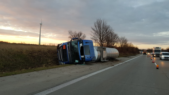 Landkreis Börde – In der Nacht zum Freitag, 25.02.2022 gegen 2 Uhr verunfallte auf der A14 Fahrtrichtung Schwerin auf Höhe Niederndodeleben ein Tanklastzug, als er in den Böschungsbereich fuhr und zur Seite kippte. Die Fahrerin wurde leicht verletzt. Es kam zur teilweisen Sperrung der Richtungsfahrbahn Schwerin.